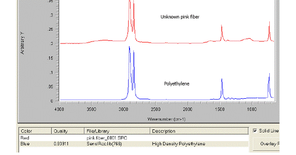 - Diversi lotti di fibre sospetti sconosciuti sono stati inviati al laboratorio per un periodo di diverse settimane. Ci hanno chiesto di esaminarle, studiarle al microscopio, determinare alcune proprietà fisiche, ed eseguire analisi elementare mediante spettroscopia a dispersione di energia (EDS) e di gruppi chimici da trasformata di Fourier spettroscopia infrarossa (FTIR). Anche alcuni campioni dovrebbero essere analizzati da Fourier spettroscopia Raman (FT-Raman).