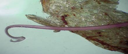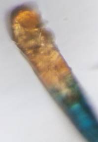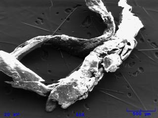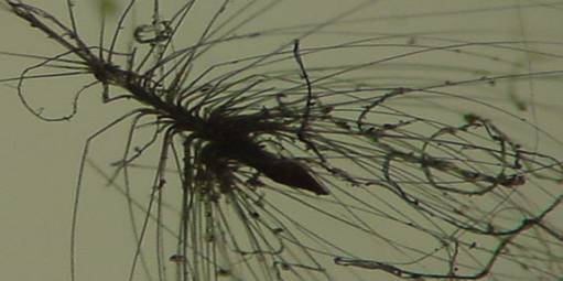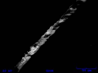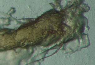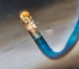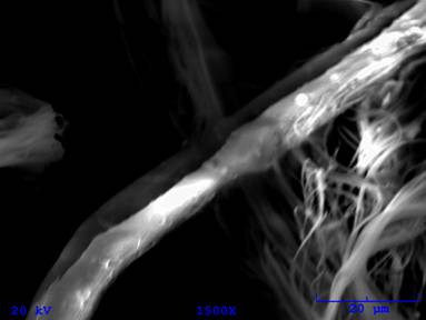 - 2. Questi campioni di fibre assomigliano alcune delle fibre precedentemente presentate, ma non del Morgellons "Goldenhead", che chiameremo una figura di riferimento primario. Lo fanno assomigliare del Morgellons "Goldenhead" che è o 1) non completamente sviluppato, 2) di essere scartato o 3) deterioramento. Osservare la forma e l'immagine SEM del filo nanotubo / siliconica standard che ha la forma "memoria" di una linguetta che è piegato verso il basso / alto (a causa della posizione di riferimento).