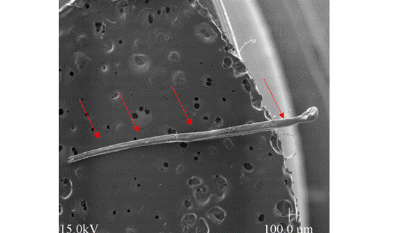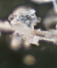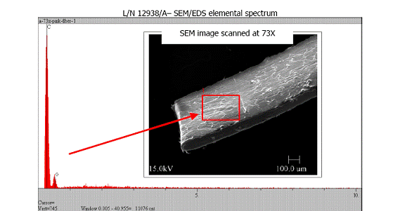 - Il campione mostra carbonio e ossigeno presente con il test EDS. Gli altri elementi dovevano minime da rilevare. Il campione è stato testato con Test Raman e risultato essere di polietilene ad alta fibra di densità (HDPE) con una traccia di un altro composto. Non sono stati identificati gli altri composti. Il suo punto di fusione è 115 ° C, con una lunghezza di 0,8 um.