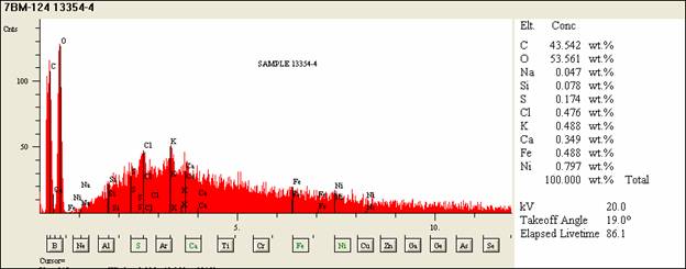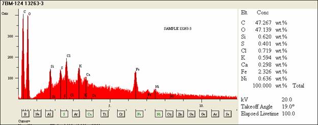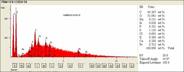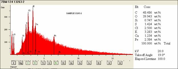 - 6. Esempio 13263-2 (senza foto SEM). Notare l'altissima quantità di potassio 30,222%, 12,905% di calcio, ferro 18,442%, 11,117% di zolfo, cloro 21,567% e 5,767% di silice. Un problema generale di questi dati EDS rispetto al campione 13.263-1 è che il calcio rende il nanotubo, così quando si rompe dal terreno circostante bio, produrrà un nanofilo carbonio silice o un filo di silice.