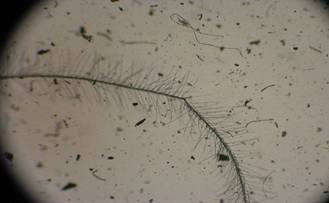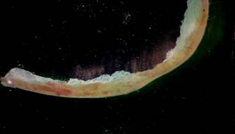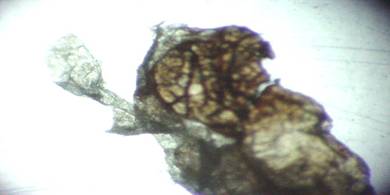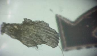 - 3) Uno spettro FTIR di un punto sulla fibra indicava la presenza di fibra di polietilene ad alta densità più una traccia di un altro materiale (marrone gel). Fibra dimensione 0,8 um e un punto di fusione di 115 gradi C.
