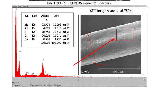 - 3. Dati EDS per i tre campioni di fibre mostrano la presenza di sei elementi: sodio, alluminio, fosforo, calcio, zolfo e cloro, che potrebbe essere dovuto alle fibre minerali naturali. Ulteriori test di Raman in fase III dimostra che erano nanotecnologie (strutture artificiali).