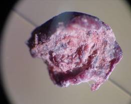 - 2) Close-up foto e microfotografie (1.000 x) mostrano la fibra rosa a sinistra della foto del campione No. 12938-A.