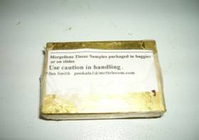 - I campioni sono stati raccolti e sottoposti a IHI, LLC da parte di un individuo in Texas. Le immagini SEM assomigliano un Morgellons come "Goldenhead" all'interno di un nanotubo. Questi tre esemplari sono stati da fibra di particelle cadono dopo un Chemtrail spruzzatura. Questi materiali una volta sulla superficie del terreno possono essere suddivisi in parti più piccole che possono essere classificati come nano array, se ogni sezione funziona come una singola unità. Questi nanomateriali possono auto-assemblarsi, replicare e ampliare.